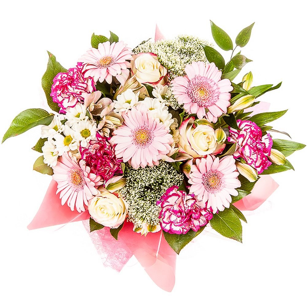 Standard Roses, Mini Gerberas, Santini Chrysanthemums, Gypsophila, Alstroemerias, Carnations & Decorative greenery (14 stems)